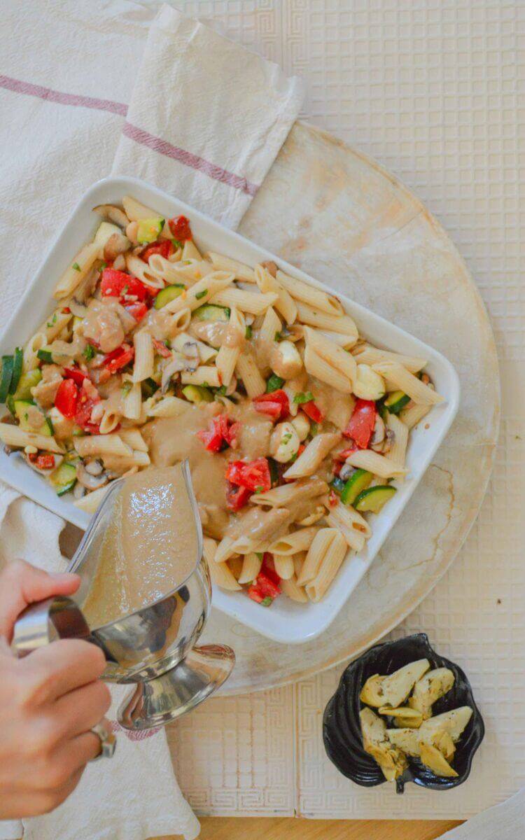 Das Spezialdressing à la Adelina enthält neben den klassischen Zutaten wie Olivenöl und Balsamico Essig auch Hummus. Dadurch wird das Dressing schön cremig und verleiht dem Nudelsalat noch eine Extraportion Proteinen und Ballaststoffe. Je nachdem welche Geschmacksrichtung du beim Kauf vom Hummus wählst, ändert sich dann auch das Ergebnis. Ich würde hierfür einen neutralen Hummus empfehlen.